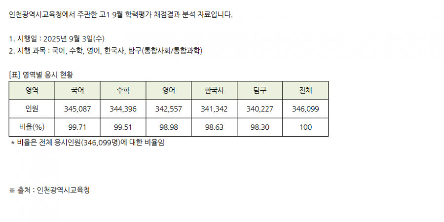 2025년 9월 고1전국연합학력평가 성적 통계자료